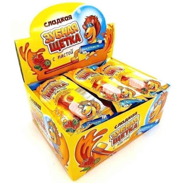 Сахарное драже и жидкая карамель "Сладкая зубная щетка с пастой" со вкусом клубники.