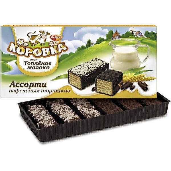 Ассорти тортиков "Коровка" от фабрики "Рот Фронт" – 6 мини-тортиков из хрустящих воздушных вафель, прослоенных ароматной молочной начинкой. Каждый покрыт нежной шоколадной глазурью и украшен двумя видами посыпки из светлой и темной шоколадной крошки.