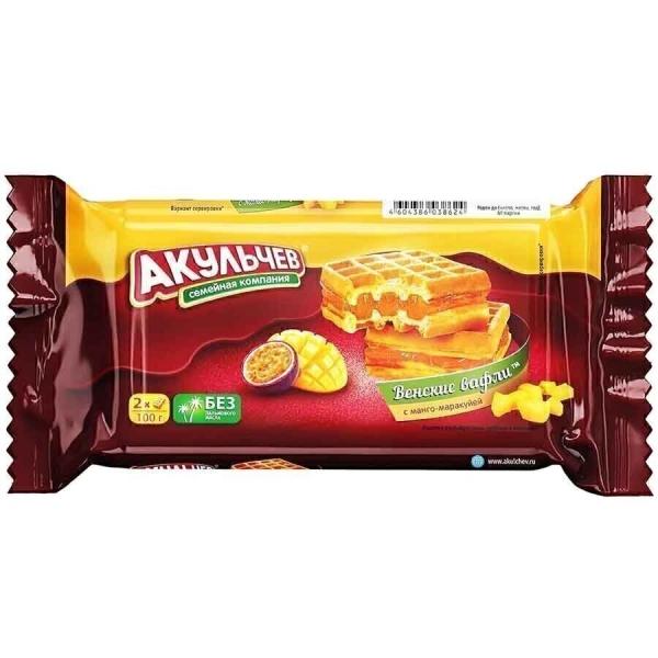 Гофрированные мучные изделия с прослойкой из фруктово-ягодного джема в индивидуальной упаковке. Две квадратных вафли с