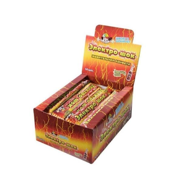 Длинная жевательная конфета "Электрошок" с кислой начинкой со вкусом колы. Между слоями конфеты находится слой кислой шипучки.