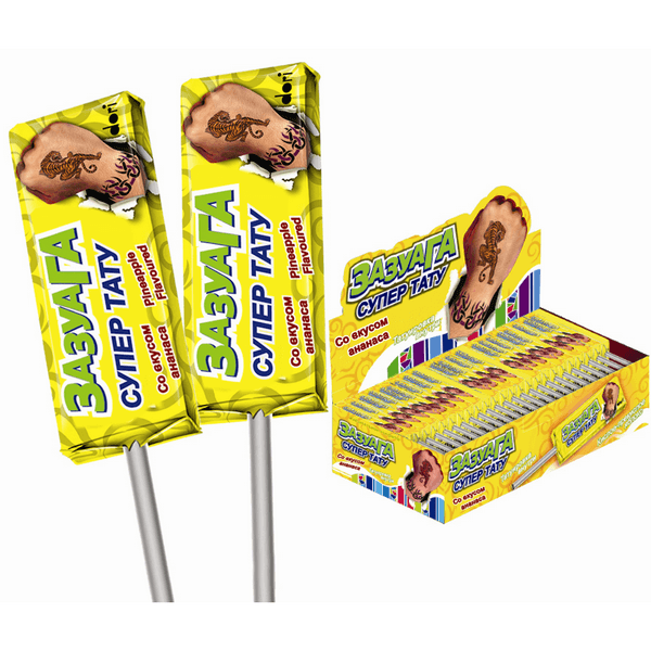Жевательная конфета Зазуага на палочке с тату 11,2г*50*(12бл) Ананас Жевательная конфета  Зазуага на палочке с тату 11,2г*50*(12бл) Ананас