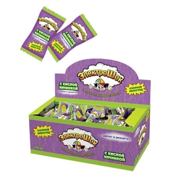 Жевательная резинка "Электрошок" с сахаром и начинкой, с ароматом винограда, в индивидуальной упаковке.